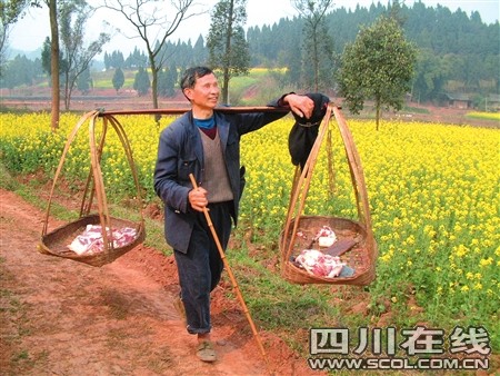 “割肉喲——”昨日上午11點,一陣抑揚頓挫的吆喝聲,從遂寧市安居區西眉鎮一個菜花飄香的小山村里飄蕩而出,但你絕對想不到的是吆喝賣肉的居然是位盲人。他叫楊中模,67歲,只見他挑著豬肉擔子、手拿竹竿、小心翼翼地在鄉間小道上前行。他雖然看不見,但他割肉、稱秤、算賬、認錢、記賬這五大功夫堪稱精、準、狠、牛,因此又被網友稱為“五牛牌”賣肉翁。