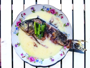 3. 洗凈宰好的鯽魚,刮去腹內黑膜,摳掉鯽魚的咽喉齒(位于鰓后咽喉部的牙齒,泥腥味很重),瀝干水分;