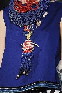 這串頸飾有些夸張,卻富有創意。使用紅白藍三色搭配藍色上衣,顯得十分活潑,也充滿了法蘭西的浪漫。