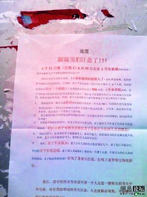 事情源于該女生在4月21日晚的一次不愉快的電梯經(jīng)歷。據(jù)稱,當(dāng)晚6點55分左右,該位女生在2號實驗樓與幾個“齷齪男”一起乘電梯。期間,女生慘遭“齷齪男”們毛手毛腳。雖然當(dāng)時十分憤怒,但鑒于一個人“勢單力薄”,被“猥褻”的女生忍著沒有作聲。她暗暗記下了幾個“齷齪男”上課的實驗室,并寫下這張大字報,貼在大學(xué)校園內(nèi)。
