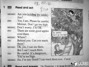 大家去學農去摘蘋果,Han Meimei爬在梯子上,Jim就很緊張地在下面喊“Be careful!”(當年的英文教材)
