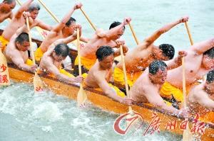 作為主辦方,聚龍村村長周廣耀說。如今已經提出“廣佛同城”,我們計劃從今年起將“世代同飲一江水,獅舞龍騰賀同城”作為今后龍舟賽的口號。據悉,由于今年是廣佛同城第一年,前來聚龍村的龍舟也較往年多,共有32條,10條來自荔灣區的山村、海北村等,一條來自白云區,其他來自鹽步橫江、聚龍、大瀝謝邊及黃岐等地。在這些龍舟中,其中6條僅游河,26條參加比賽。