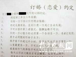 “約定好3年至6年結(jié)婚”、“吃飯前必須默念對(duì)方的名字一次”、“任何一方心情不好必須第一個(gè)告訴另一方,違者打屁股”、“每天思念對(duì)方的時(shí)間不可少于3小時(shí),不可多于24小時(shí)”……揚(yáng)州大學(xué)大一男生陳翰和在安徽求學(xué)的女友廖倩,近日簽訂了一份《戀愛約定》。端午小長假,陳翰將帶著這份“合約”回家,請(qǐng)家長簽名。