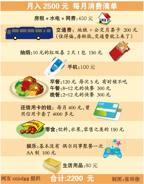 近日,一名剛剛踏入職場的年輕白領szjsdgg在大洋網上稱自己“月薪2500元在廣州的生活”:大學畢業1年半,工作1年多,現在在廣州拿著2500元左右的月薪,剛夠基本生活開銷,只剩下300元。