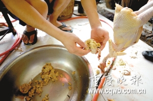 曾經,雞販給活雞增重,主要方式是手工灌玉米、涼粉、石子和泥巴,市民很容易識破。現在,不良分子將石粉攪成糊狀后,用機器灌入雞嘴的伎倆已經出現,市民很容易被麻痹。最瘋狂的灌法,一只雞體內石粉可到半公斤。主城市民每天要用土雞的價格,為近一噸的石粉買單。不過,不用緊張,“一摸二看三稱”的辦法可防上當。