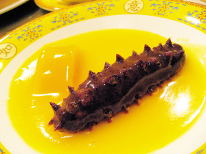 這種餃子太獨(dú)特了,是花樣餃子的一種,尤其是遼參餃,它是餃子宴以現(xiàn)代時(shí)尚形式開席的第一道,褐色晶亮澆著汁的遼參一上桌就驚艷四座,要不是吃心不改提前就知道,也許會(huì)驚呼出來,真的太像了,幾乎毫無破綻。這遼參餃外皮是黑米面,是如今最流行的甜餃子面皮,遼參的刺兒是用剪子剪出來的,主廚還嫌這次的刺兒剪得太有規(guī)律了,有點(diǎn)不像了,面皮里面的餡是什錦豆沙,一點(diǎn)都不甜膩,外澆的是橙汁,配菜是南瓜,真是一道養(yǎng)眼開胃又能帶來驚喜的餃子呀!其實(shí)它是蒸餃的一種,而且還可以換芝麻芋泥、八寶雪梨、五仁山楂等其他甜餡兒,但是要提前預(yù)訂。