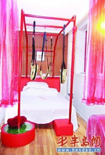 “這些床有的是電動床,有的是水床,睡上去十分舒適的,都是我們花幾萬元進的。床上的鐵架子上可以掛上很多秋千,情侶們可以在房間享受蕩秋千的樂趣。有的床邊還有兩根細柱子,是可以用來跳鋼管舞的。我們還進了一批瑜伽球準備這幾天充好氣放在房間里。”說罷,崔先生把五個豹紋圖案的秋千掛在床的鐵架子上,展示給記者看。