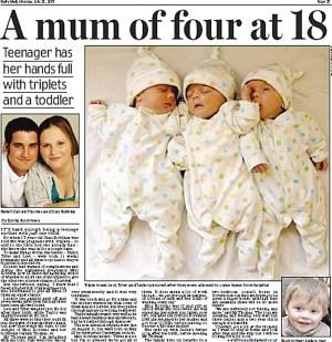 目前,斯安和2歲的兒子加登住在一套政府提供的廉租公寓中,完全靠政府救濟(jì)生活,她每月能領(lǐng)到1126英鎊救濟(jì)金,其中包括房租、兒童福利和家庭稅收貸款。盡管如此,斯安母子二人的生活仍十分拮據(jù)。去年,斯安又結(jié)識(shí)了19歲的新男友卡魯姆·托馬斯,盡管斯安和卡魯姆都沒(méi)想過(guò)要生孩子,但去年10月,當(dāng)時(shí)只有17歲的斯安卻再次意外懷上了身孕。更讓斯安做夢(mèng)也沒(méi)想到的是,她懷上的竟是一組三胞胎!