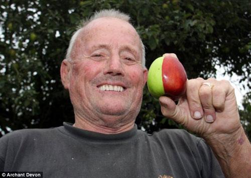 家住英國德文郡的肯·莫里斯近日無意中發(fā)現(xiàn),家中花園的蘋果樹上結(jié)了一個奇怪的蘋果:半紅半綠,而且從中間完美地區(qū)分開。老人猜想,大概有人搞了惡作劇,把他的蘋果涂成了這種顏色。