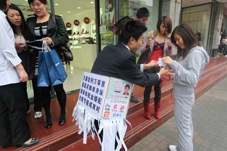 昨天上午8點半,天涯論壇上海版上一片“雷人”的呼聲,原來一個圖片帖“光棍兇猛,圍觀上海南京路求愛牛人!”引來了網友們熱議。記者在帖子里看到,一個高高瘦瘦的西裝男,套著個面上寫有“無妻徒刑萬事累,基因求緣單身妹,誰來和我金婚配,光棍節前成雙對”,底下黏有無數寫滿聯系方式紙條的硬紙箱“草裙”,在人民廣場地鐵出口處到處找姑娘派發小紙條,路人紛紛駐足觀看,有女孩還