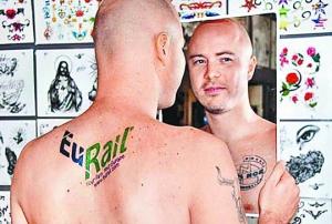 信息時報綜合報道 據英國媒體3日報道,澳大利亞一名失業漢知道雙親渴望到歐洲旅行后,為讓他們今年有個難忘的結婚周年紀念,毅然向歐洲鐵路公司提出建議,他把該公司的標志賣廣告文在身上,換取兩張免費歐洲游車票,沒想到最后竟得償所愿。