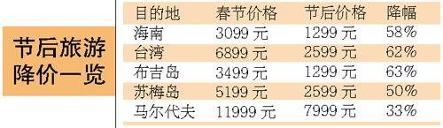 除海南游外,節后旅游價格都普遍下滑,比如我國的臺灣游、東南亞的海島游。其中臺灣游的價格跌幅最大,降幅超過了六成。