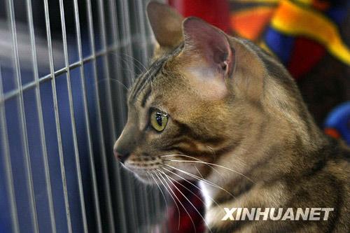 3月27日,在保加利亞普羅夫迪夫,一只孟加拉貓?jiān)趯櫸镓堈股险钩觥槠趦商斓钠樟_夫迪夫國(guó)際寵物貓展在這里舉行,200多只寵物貓參展。新華社發(fā)(維爾科·安科洛夫攝)