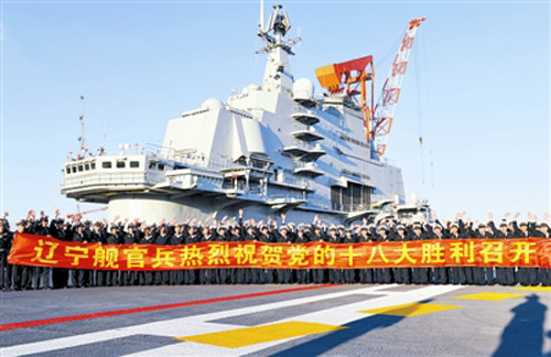中新網(wǎng)11月8日電 據(jù)中國(guó)軍網(wǎng)海軍頻道報(bào)道,11月7日,我軍首艘航母、海軍“遼寧艦”上千名官兵展開(kāi)鮮紅的彩色條幅,高聲歡呼,歡慶黨的十八大勝利召開(kāi)。