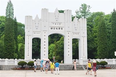 游客在芷江受降紀念坊前參觀拍照。 新華社記者 白 禹攝