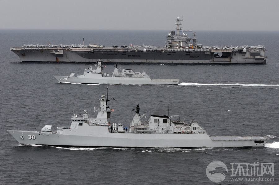 馬來西亞海軍戰(zhàn)艦與美軍華盛頓號航母組成編隊(duì)航行