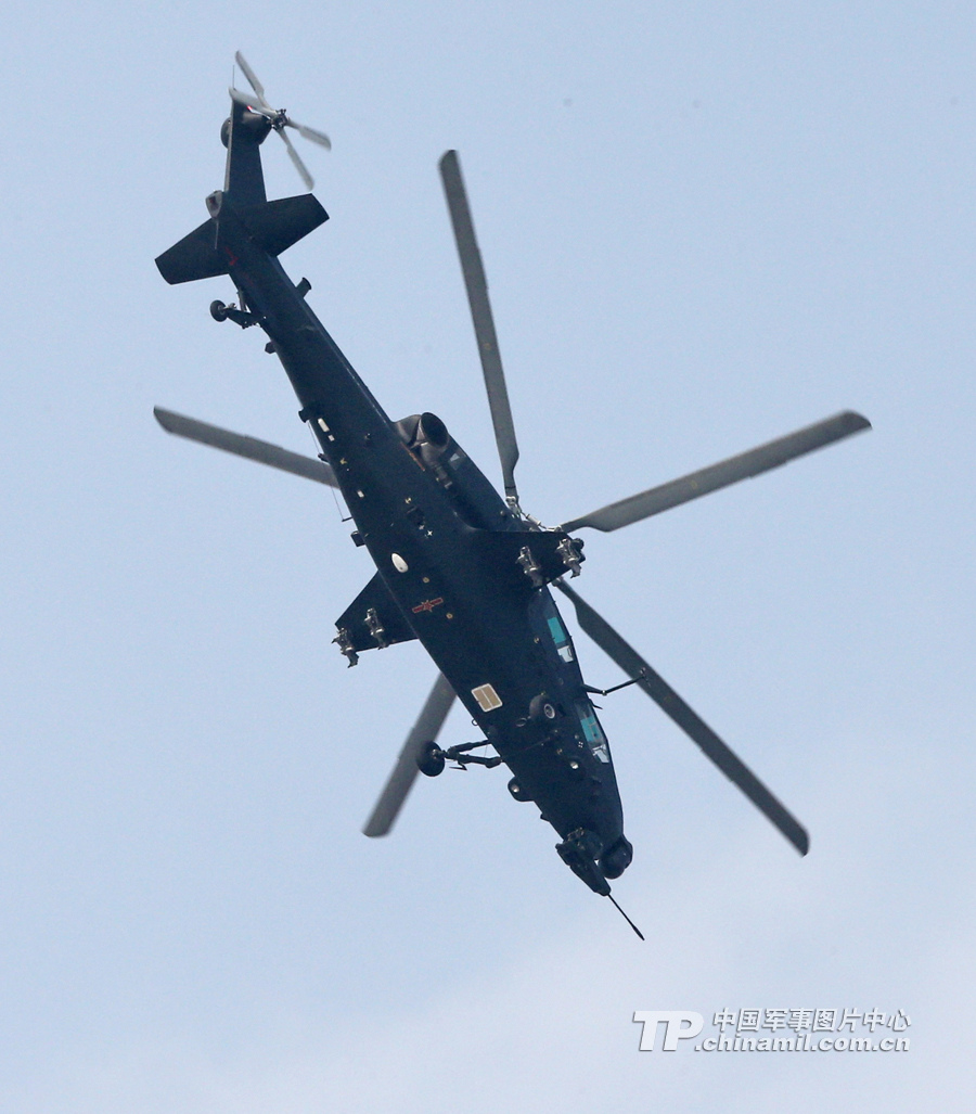 11月13日,我國自主研制生產的武直-10武裝直升機亮相在珠海舉行的第九屆中國國際航空航天博覽會,在飛行表演中展示了這款直升機的優良性能。圖為武直-10對地垂直攻擊。記者喬天富 攝