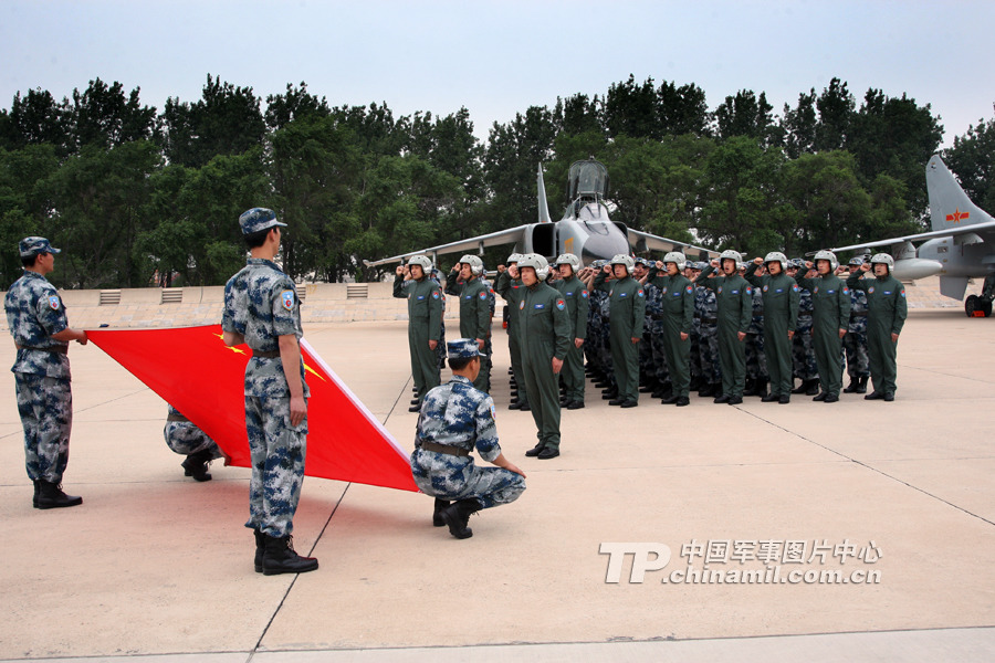7月27日,參加中俄聯演的空軍戰斗群官兵出征前在國旗前集體宣誓,立志圓滿完成聯演任務,為祖國爭光。曹占禮攝