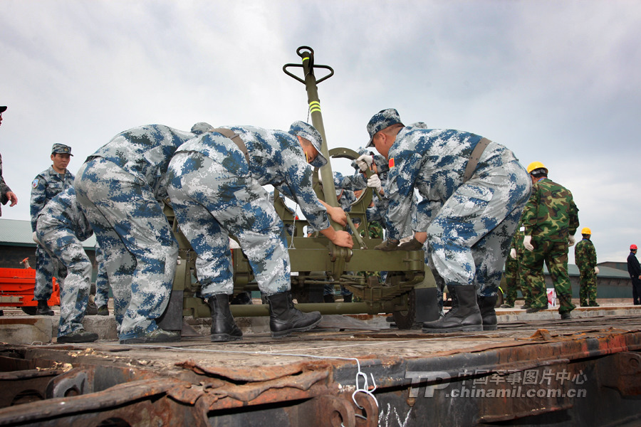 7月27日,參加中俄聯演的空軍戰斗群地轉官兵在滿洲里火車站正往俄方專列上裝載裝備。 曹占禮 攝