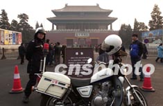 十五日,一位交警正在北京故宮神武門廣場執(zhí)勤。從當天開始,神武門外停車場被取消。故宮博物院的通告說,此舉是為了恢復紫禁城周邊凝重幽靜的壯美景觀。作者:張煒