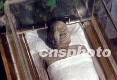 中國長沙馬王堆國寶級文物——著名的西漢辛追貴夫人的遺體,十六日凌晨兩點成功搬入長沙博物館“新居”,既新建的現(xiàn)代化陳列館展覽地宮里。專家為貴夫人換了一個新的水晶玻璃棺,并灌注新的保護液。辛追夫人遺體在地下埋藏了兩千多年后,又經(jīng)過三十年的保存和展覽,仍然完好無損。作者:中新社