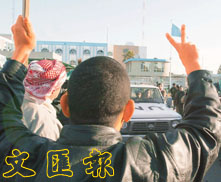 數(shù)百名伊拉克記者聚集在運(yùn)河酒店門外,在一九九一年海灣戰(zhàn)爭(zhēng)周年舉行抗議活動(dòng)。于海灣戰(zhàn)爭(zhēng)中,伊拉克部隊(duì)占領(lǐng)了科威特七個(gè)月后,被以美國(guó)為首的盟軍驅(qū)逐出科威特。