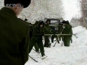 搶險隊雪阻現場清理積雪(中央電視臺畫面)