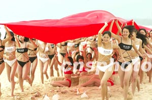 二百零三名模特佳麗二十二日在海南三亞亞龍灣參加“三亞與美麗同行活動”,手持紅色綢帶向全國人民拜大年。作者:毛建軍