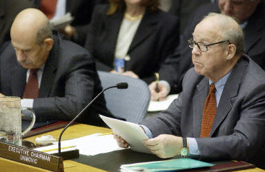 聯合國監核視委主席布利克斯(右)和國際原子能機構總干事巴拉迪向聯合國安理會匯報對伊武器核察工作情況。