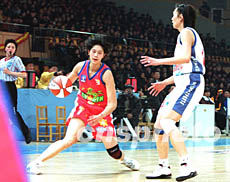 一月二十八日晚,2003中國女籃WCBA全明星賽在河北省秦皇島市奧體中心開賽,八一隊隊員隋菲菲(左)第二次獲得聯賽最有價值球員稱號。作者:廖文靜