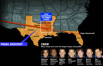 圖:哥倫比亞號失事地點和宇航員示意圖