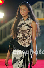 身著著名設計師房瑩新款時裝的模特,新春佳節在海南三亞亞龍灣上演時裝秀。作者:毛建軍