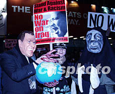 當地時間二月五日,在鮑威爾向聯合國提交伊拉克擁有大規模殺傷性武器新證據的同時,數百人在紐約時代廣場集會,反對美國對伊拉克開戰。傍晚時,越來越多下班的紐約人自動加入,集會遂演變為沿著四十二街行進的反戰示威游行。圖為帶著布什面具的示威者。作者:龔文謨