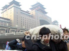 一隊肩扛大包的民工慶幸抵達了北京。據中國鐵道部春運辦的消息,僅2月7日,中國鐵路旅客發送量達426.4萬人次,創歷史新高。預計春節后第二個客流高峰將在二月中旬出現,目前許多車站已無票可售。作者:杜洋
