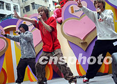 香港音樂組合E-KIDS二月九日在銅鑼灣時代廣場舉行的情人節(jié)“戀人短訊”大募集活動上助興演唱,吸引眾多歌迷。