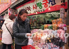 情人節將至,氣候寒冷的韓國首都漢城市刮起“情人節熱浪”,許多專門銷售情人節糖果的專賣店吸引了不少選購情人節禮物的女青年。作者:任晨鳴