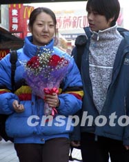 北京姑娘在“情人節”當天得到男友一束鮮花。這一天,在西單商業街,這種場面比比皆是。作者:鄒憲