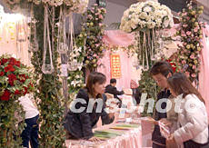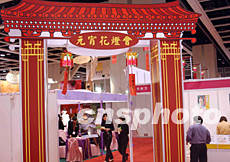 第三十屆情人節婚紗及結婚用品展,二月十四日在香港會展中心開幕,參展商為歡度元宵佳節在展會上搭起燈會牌坊。作者:錢興強