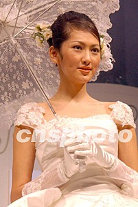 第三十屆情人節婚紗及結婚用品展,二月十五日在香港會展中心舉行。圖為香港名模展示婚紗。錢興強 攝