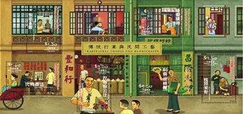 該套郵票描繪六種傳統(tǒng)行業(yè)與民間工藝,包括代寫(xiě)書(shū)信、制造雀籠、縫制旗袍、梳頭美發(fā)、捏面粉公仔及叫賣(mài)“飛機(jī)欖”。