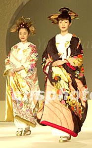 日本著名時(shí)裝設(shè)計(jì)師桂由美(Yumi Katsura)結(jié)合日本傳統(tǒng)和服的美感,創(chuàng)作出新穎的時(shí)裝,十八日在東京展示。作者:陶光雄