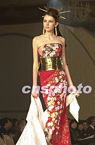 日本著名時(shí)裝設(shè)計(jì)師桂由美(Yumi Katsura)結(jié)合日本傳統(tǒng)和服的美感,創(chuàng)作出新穎的時(shí)裝。圖為桂由美新春在東京展示的一款紅色晚禮服,它由白色的和式禮服魔術(shù)般地變化而來(lái),依然保留著和服束身的風(fēng)格與美感。陶光雄 攝