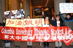 圖為紐約中國球迷穿著“我愛姚明”的T恤衫在場外迎候隊(duì)員到來。作者:龔文謨