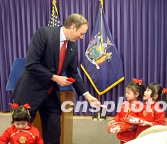 紐約州州長柏塔基二月二十六日在其位于紐約曼哈頓中城的辦公室舉行儀式,向亞裔社區恭賀羊年新春。柏塔基按照華人的傳統習慣給前來表演助興的華裔兒童發“賀歲紅包”。作者:趙海燕