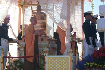 今天早上,泰國(guó)曼谷空軍機(jī)場(chǎng)舉行了隆重的送歸儀式。泰國(guó)文化部長(zhǎng)烏萊婉致詞,她以泰國(guó)政府、佛教界和全國(guó)人民的名義,衷心感謝中國(guó)政府為慶祝泰國(guó)國(guó)王陛下75圣壽大吉,同意佛牙舍利自2002年12月15日至2003年2月28日共76天,赴泰佛統(tǒng)府佛教城臨時(shí)供奉76天。她說(shuō),供奉期間,泰國(guó)人民前往佛教城舉行各種各樣的參拜活動(dòng)。泰國(guó)王儲(chǔ)殿下于1月9日代表國(guó)王陛下前往參拜,泰國(guó)佛教最高領(lǐng)袖僧王兩次參拜,泰國(guó)樞密院主席、國(guó)會(huì)主席、上議院主席、內(nèi)閣主要領(lǐng)導(dǎo)人以及眾多議員都前往參拜。在佛牙舍利臨時(shí)赴泰供奉事宜圓滿成功之際,泰國(guó)政府對(duì)中國(guó)政府和人民以及中國(guó)佛教協(xié)會(huì)表示衷心的感謝,并祝愿泰中友好萬(wàn)古長(zhǎng)青。