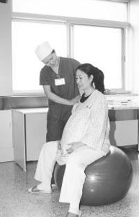 她感覺最有意思的鎮(zhèn)痛措施是:在兩次陣痛之間騎坐在分娩球椅上。分娩球是一個直徑1米的彩色充氣橡膠球,固定在有扶手的坐椅上,在規(guī)律宮縮的間歇騎坐上去,可以達到放松盆底肌肉的目的。她坐了一會兒,果然感到柔軟舒適,疼痛減輕。”