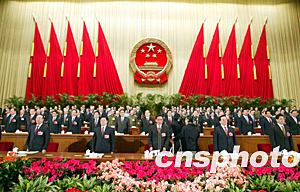 在與會五千多名人大代表、政協委員的持久掌聲中,江澤民、胡錦濤、李鵬、朱镕基、李瑞環、李嵐清、吳邦國、溫家寶、賈慶林、曾慶紅、黃菊、吳官正、李長春、羅干等中國領導人微笑著步入會場。