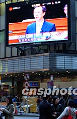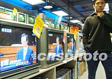 素有購物天堂美譽的香港,商家關注稅務制度改革。三月五日公布的香港2003至2004年度財政預算案成為此間商家關注熱點,圖為電器店里的電視機播出財政司司長梁錦松提交的預算報告。潘索菲 攝