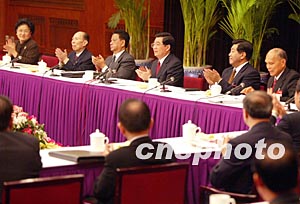 中共中央總書記胡錦濤今天上午來到全國(guó)政協(xié)禮堂會(huì)議室,親切看望了出席全國(guó)政協(xié)十屆一次會(huì)議的港澳地區(qū)政協(xié)委員,并參加了他們的聯(lián)組討論。中共中央政治局常委賈慶林參加了看望和聯(lián)組會(huì)議。
