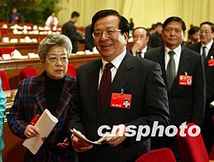 第十屆全國人民代表大會第一次會議第四次全體會議十一日在北京人民大會堂舉行,中共中央政治局常委曾慶紅與國務委員吳儀出席時一起交談。作者:毛建軍